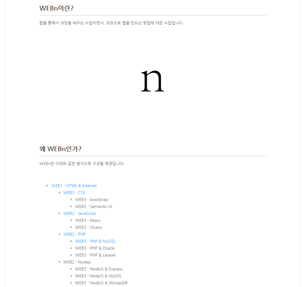 고등학교 때 자율동아리에서 '생활코딩'이라는 사이트를 통해 웹 프로그래밍을 잠깐 공부한 적이 있었다. 기초적인 내용이었음에도 불구하고 굉장히 유익했었던 기억이 났고, 입대 후에도 이 사이트에서 Github 강의를 듣기도 했기 때문에, 생활코딩 사이트를 통해 웹 프로그래밍 공부를 시작하기로 했다. 내가 고등학교 때 공부했던 '웹 애플리케이션 만들기' 수업은 현재 WEBn 수업으로 개정되어 있었다. 길고 여러 분야가 통째로 포함되어 있던 수업이 여러 작은 수업으로 분할되어 필요한 부분만 분리해서 학습할 수 있도록 만들어져 있었다. 한번에 오래 (4~5시간씩) 공부할 수 없고, 변수가 많은 군대의 환경 상 생활코딩의 WEBn 수업은 내게 매우 적당하게 느껴졌다.