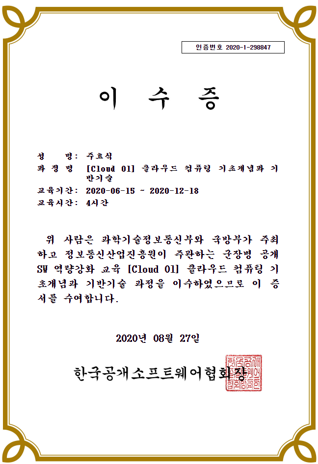 | 국방오픈소스아카데미 - 2020 군장병 공개SW 역량강화교육, 그 도전을 마치며 (0) | 2020.08.30 |