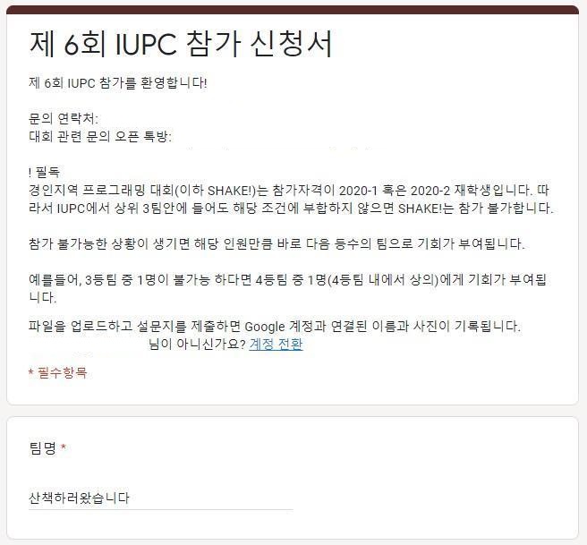 대회에 참가하려면 팀을 구성해야 했는데, 운 좋게도 친한 형 한 명과 나와 마찬가지로 군 복무중인 친구를 설득해 팀을 구성했다. 우리 셋 모두 실력이 뛰어나지는 않았기 때문에, 수상은 생각도 하지 않고 대회 참가 자체에 의의를 두기로 했다. 문제 구경 겸 대회 산책이 목표라, 팀 명은 '산책하러왔습니다'로 정했다. 군 휴학생 참여가능 여부와 예비 소집, 진행 방식 등 궁금한 점을 해결한 뒤, 속전속결로 바로 참가신청서를 제출했다.