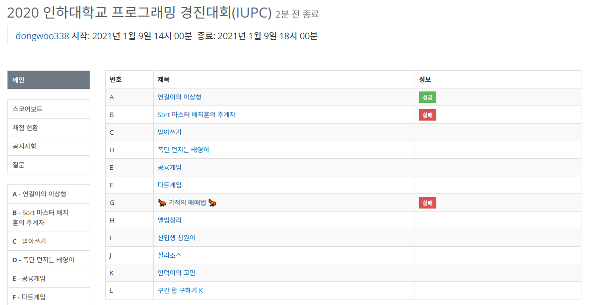 12월 말, 친구에게 제 6회 인하대학교 프로그래밍 경진대회(IUPC)가 개최된다는 소식을 접했다. 2학년을 다니던 2019년에는 실력의 부족과 대회 참여에 대한 막연한 두려움으로 IUPC에 참가하지 않았는데, 도전해보지도 않고 포기해 후회가 남았었다. 이번 대회는 코로나-19로 인해 온라인 방식으로 개최되고, 재학생 뿐만 아니라 휴학생도 참가할 수 있었다. 덕분에 나와 마찬가지로 군인 신분이었던 친구 역시 참가한다고 했다. 비록 현재는 알고리즘을 접한 지 1년이 넘어 실력이 오히려 더 떨어졌지만, 좋은 경험이 될 것 같아 참가하고 싶다는 생각이 들었다.