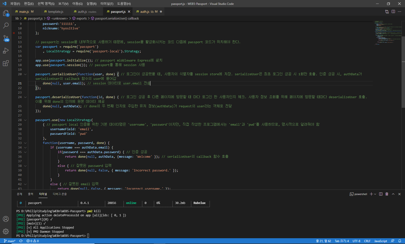 강의의 분량은 짧았지만, 내용이 꽤 어려웠다. 여러 개의 함수들이 서로 인자를 주고받으며 상호작용했던 탓에 머릿속에서 로직이 부드럽게 연결되지 않았다. 또 솔직히 말해서 전역을 앞두고 후임들과 조금 더 추억을 쌓고 싶은 마음에 공부에 소홀해진 부분도 영향이 컸다. 학습을 연속적으로 하지 못하니 이전 학습 내용을 잊어버렸고, 자연스레 진도를 나가는 속도도 더뎌졌다. 때문에 이고잉님의 강의나 Passport.js 사이트의 설명뿐만 아니라 구글링으로 다른 블로그들에 정리된 내용을 찾아보며 이해하기 위해 노력했다. 사실 학습을 끝내고 얼마 지나지 않아 후기는 전역 한 이후에 작성하게 되었는데, 몇 주만에 코드를 다시 뜯어보니 잘 와닿지 않아 다시 찬찬히 복습한 끝에 후기 작성을 완료할 수 있었다.