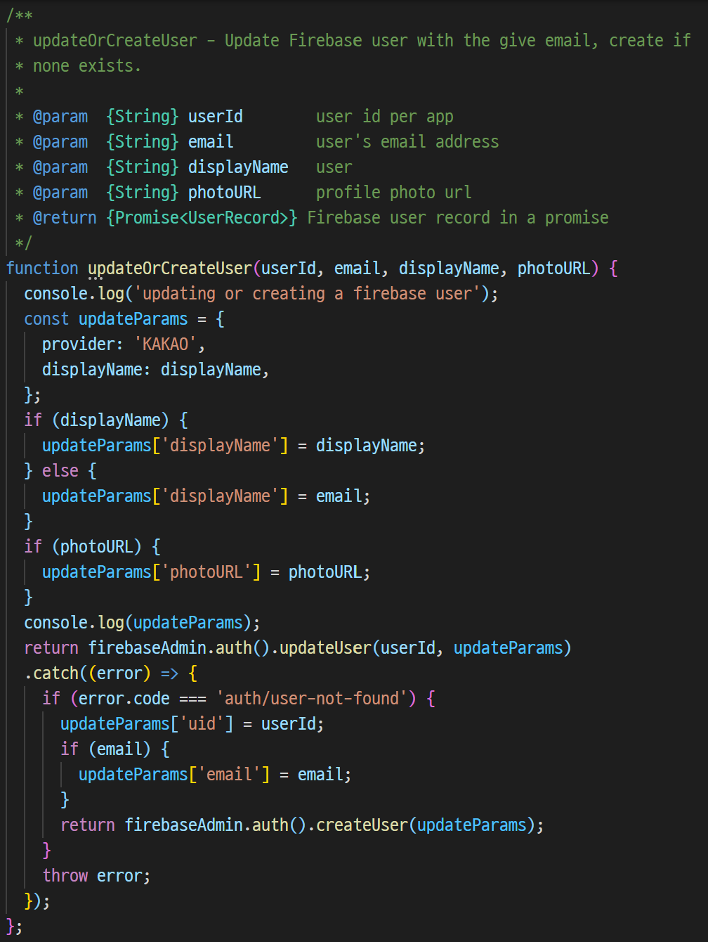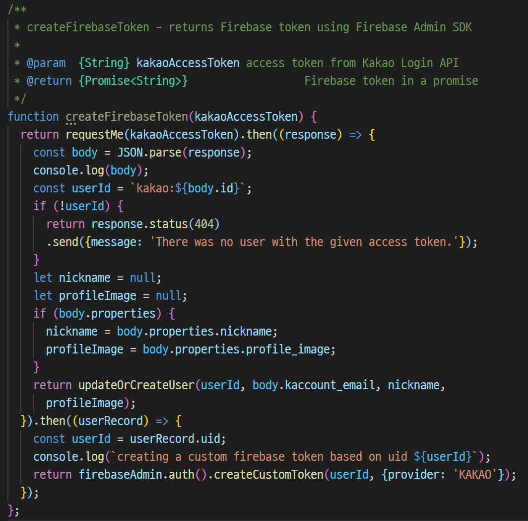 updateOrCreateUser는 카카오 사용자 정보를 인자로 전달받고, 최초에는 사용자가 이미 존재한다고 가정하고 받아온 정보를 활용해 Custom Token을 만들고, updateUser 함수를 호출한다. 만약 여기서 'user-not-found' 에러가 발생한다면, 사용자가 존재하지 않는 것이므로, Custom Token을 인자로 해 createUser 함수를 호출한다.