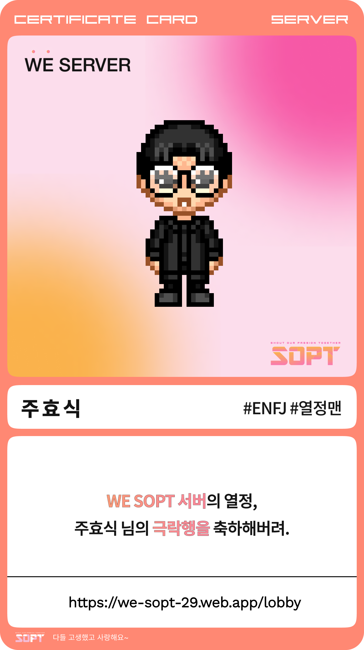 1. 들어가며 얼마 전, SOPT 29기 'WE SOPT'의 공식적인 일정이 모두 종료되었다. 정말 많은 것을 느끼고 배우며 성장했던 소중한 시간이었고, 이 기억의 조각들이 더 희미해지기 전에 곱씹고 기록하고