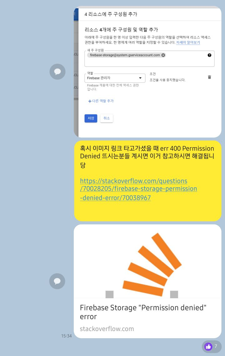 첫 번째로, Firebase Storage에 저장된 파일에 url로 접근 시, 권한이 없어 접근이 거절(Permission Denied)되는 문제가 있었다. Firebase Console에서의 Rules를 수정했음에도 이러한 문제가 발생했는데, 나 뿐만 아니라 파트원들 역시 같은 문제를 겪고 있었다. 얼마 동안의 구글링 끝에, Stack Overflow의 외국인 형님들의 조언을 따라 구글 계정에서 권한을 설정해야 한다는 사실을 알게 되었다. 시간이 꽤 지난 답변이었어서 인터페이스가 조금 달랐고, 설정 페이지의 영어가 정확히 어떻게 번역되어 있는지 헷갈리긴 했지만, 이 방법으로 문제를 해결할 수 있었다. 항상 도움만 받던 내가 처음 남에게 도움을 주는 순간이었다.