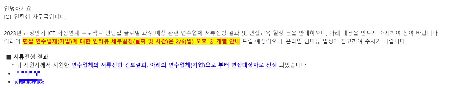 서류 검토 기간 이후, 지원한 세 곳의 기업 중 두 곳으로부터 서류 합격 결과를 통보받았다.