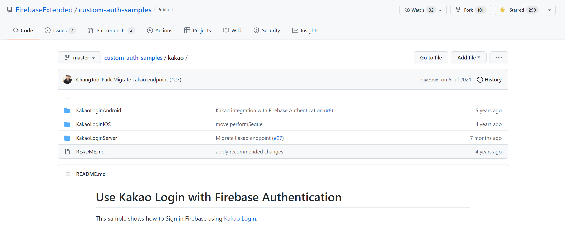 공식 지원은 되지 않지만, 한국의 많은 개발자들이 카카오 로그인을 사용하기 때문인지, Firebase Custom Auth에 카카오 API를 적용한 코드를 Github에서 발견할 수 있었다. 이 샘플 코드에서는 app.js라는 한 파일이 서버를 열고 인증을 수행하는 모든 기능을 담당하고 있었다. 우리 프로젝트에 이 코드를 적용하기 위해, 코드를 분석하고 다른 블로그들을 찾아보며 우리 프로젝트에 적용하기 위한 방법을 모색했다.