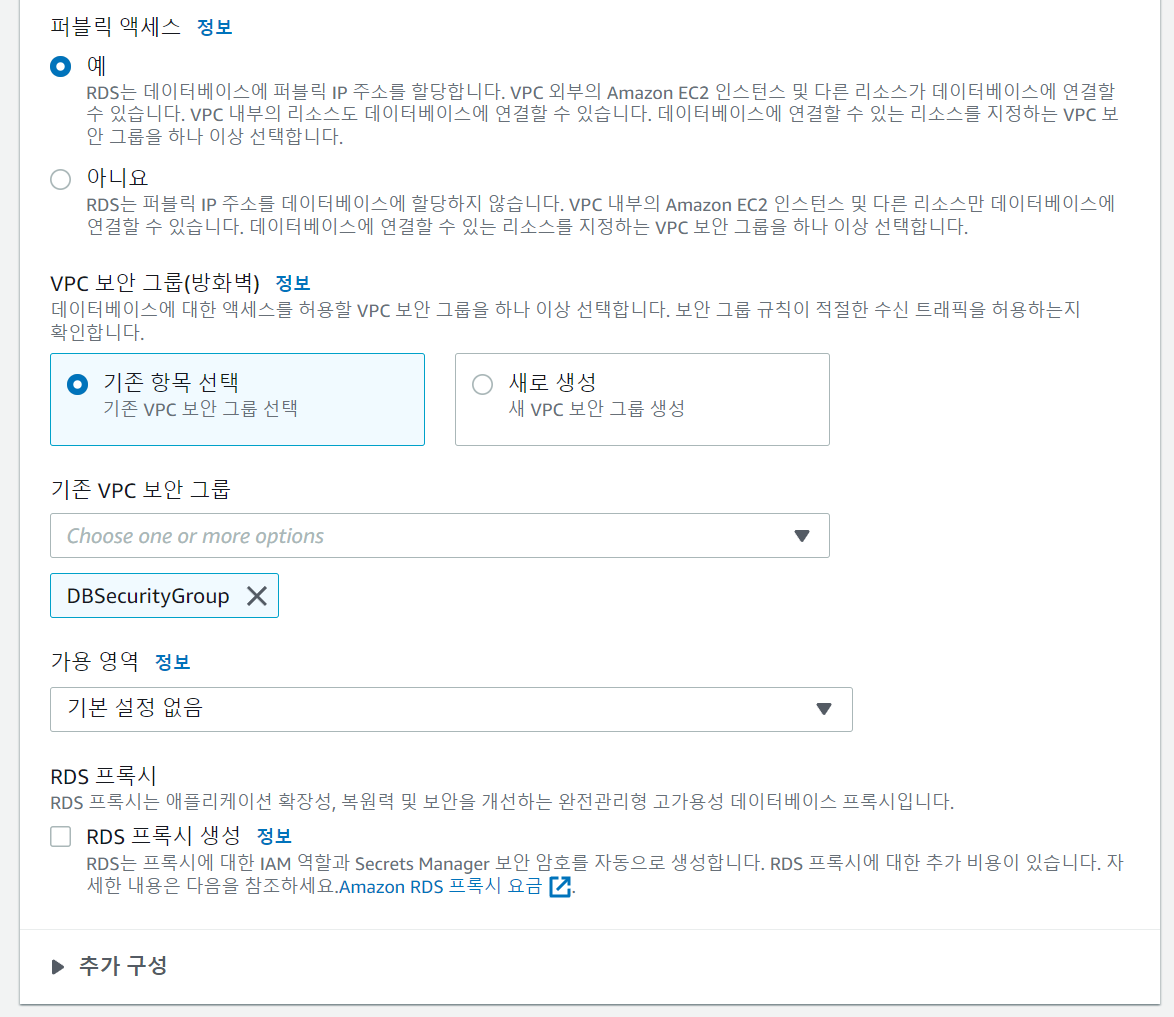 나는 Datagrip이라는 툴을 이용해 RDS에 접속할 것이기 때문에, 퍼블릭 액세스를 허용 해 주었다.